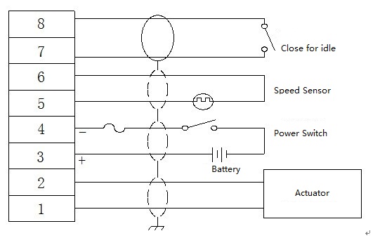 ● Interface No.1 and No.2 for connecting the Electromagnetic Actuator; Interface No.3 & No.4 for connecting the battery,the diameter of the wire is not less than 1.3 mm²,it will be better for ruducing the voltage 。For safty consideration,a 15A fuse should be connect on the cable which is connect the positive pole of battery and the actuator(interface No.3);The cable of the actuator should be connected directly and separately,pleasae refer to the following.